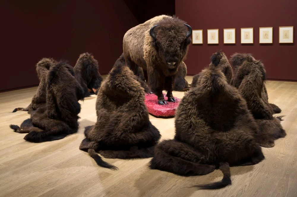 “Across Stimson’s practice, the cyclical movements of destruction and renewal are intimately bound. The decimation of the great bison herds, the displacement and starvation of Indigenous peoples, and the assimilative abuses of the residential school system were all part of a settler teleology that figures time as linear and the demise of Indigenous and Buffalo Nations as an inevitable consequence of “progress.” But in the Blackfoot lifeworld, rather than progression, balance is key, and that requires attending to all one is in relation with. In his practice, Stimson strives for balance as a truth-teller and a Trickster who tips the colonial scales in his favour. In Maanipokaa’iini he is once again renewed—both wilder and wiser—and ready for the next revolution.” — Tarah Hogue, “Cyclical returns and transformations in the art of Adrian Stimson”
